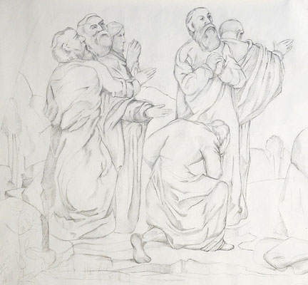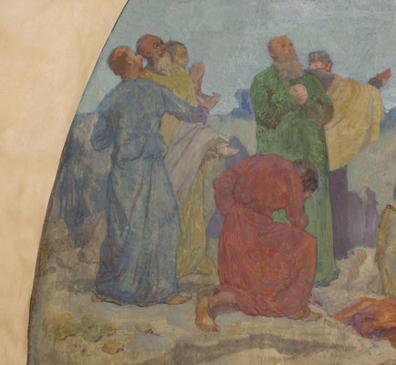 Die Himmelfahrt Christi wird begleitet von den Aposteln, die freudig, überrascht oder kniend fassungslos, ganz in Ehrfurcht den Moment erfahren. Wie kann das Unsichtbares sichtbar werden? Nur durch handelnde Personen.